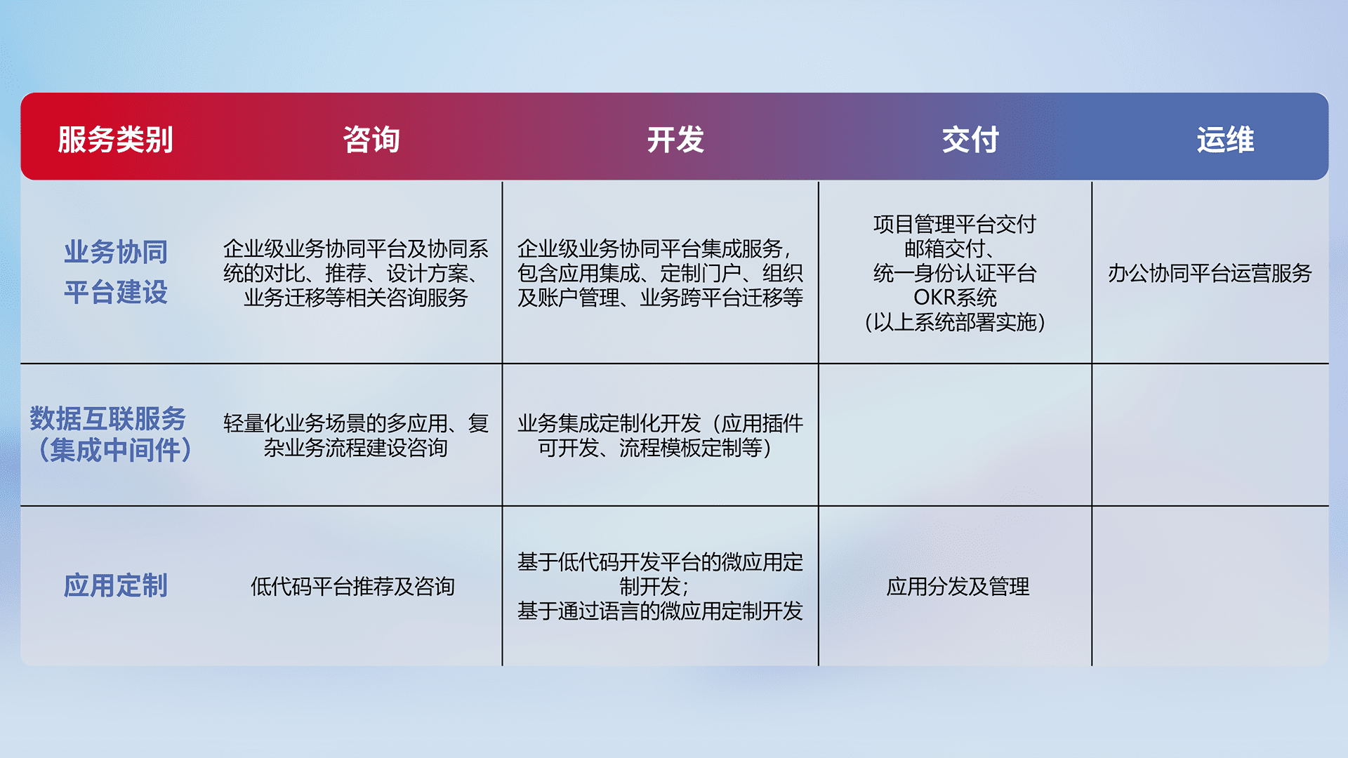针对钉钉、、企微、、、IDaas等平台级产品提供产品的规划、、、方案、、、交付、、定制化开发等服务,,,,实现如统一协同办公、、智能客户服务、、混合会议管理、、、、智能数据查询、、、、等业务场景,,实现数字化转型。。。