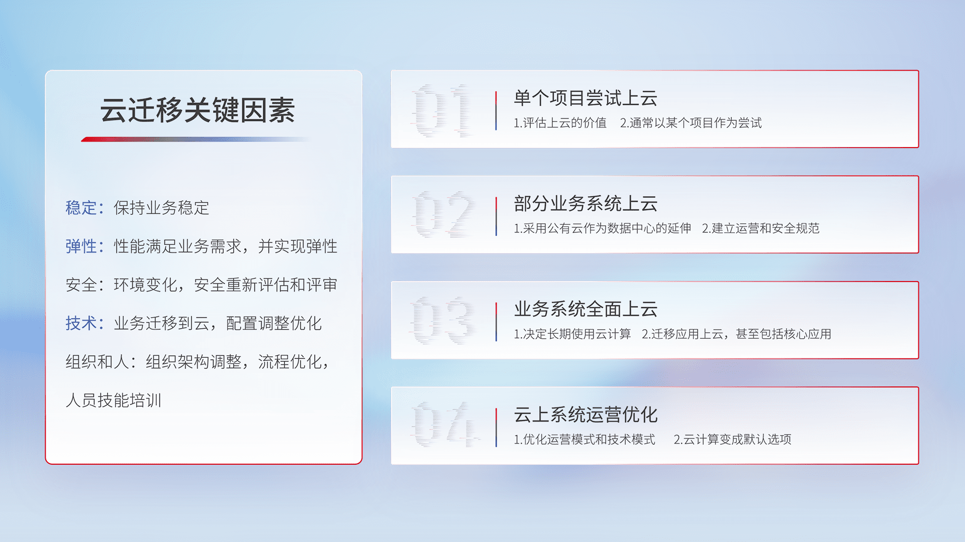 结合实际业务,,,,从规划设计、、、、云平台选型、、、云原生改造、、、数据迁移、、集成交付,,,迁移全过程为客户识别最佳上云路径,,做好风险识别管理,,,设计网络架构、、、、身份权限、、安全审计合规、、操作审计、、、、日志审计、、、、监控告警策略、、、多站点容灾设计等,,对云上基础设施进行整体规划,,提升IT治理水平,,以满足弹性、、高可用、、高性能的需求。。。