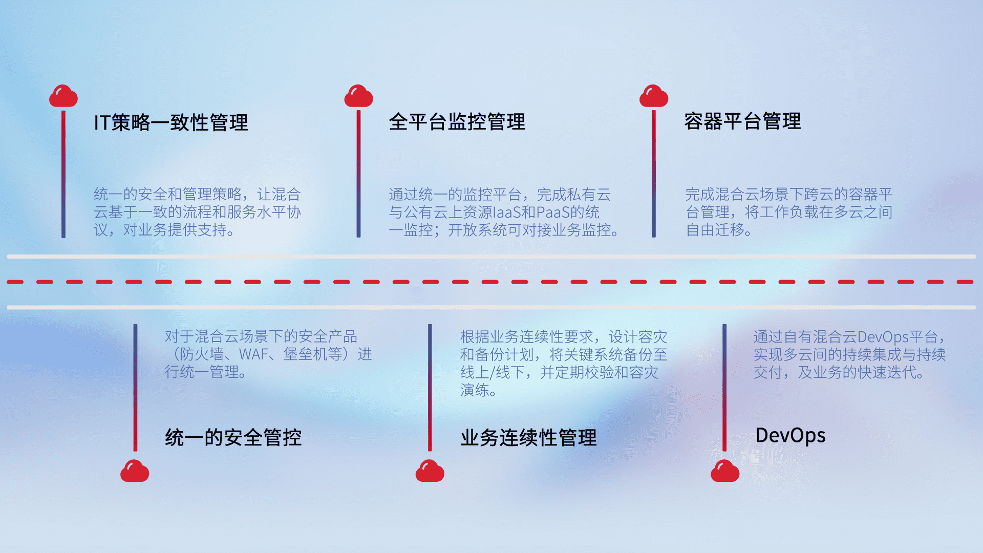 通过多云纳管,,,,以统一的资源数据模型把客户的云资源进行抽象和封装,,进而实现对多云资源的统一操作,,,,保障云资源管理的可靠性、、稳定性与可用性。。量身定制化运维内容,,,配置、、、开发运维、、补丁管理、、、、备份、、、监控、、认证和访问管理、、、审计和日常巡检等,,保障在用云过程中的可靠度,,稳定度以及高可用率。。。。