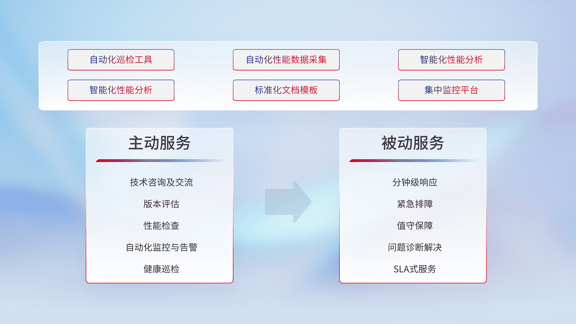 智能化工具和标准化文档,,,保障服务质量,,,提供主动服务(包含技术咨询、、、版本评估、、性能检查、、自动化监控与告警、、、、健康巡检)和被动服务包含(分钟级响应、、紧急排障、、、、值守保障、、、问题诊断解决、、SLA服务)。。。。